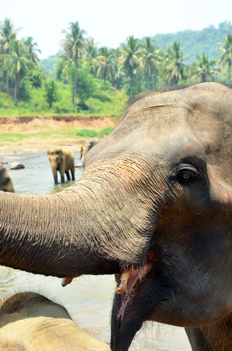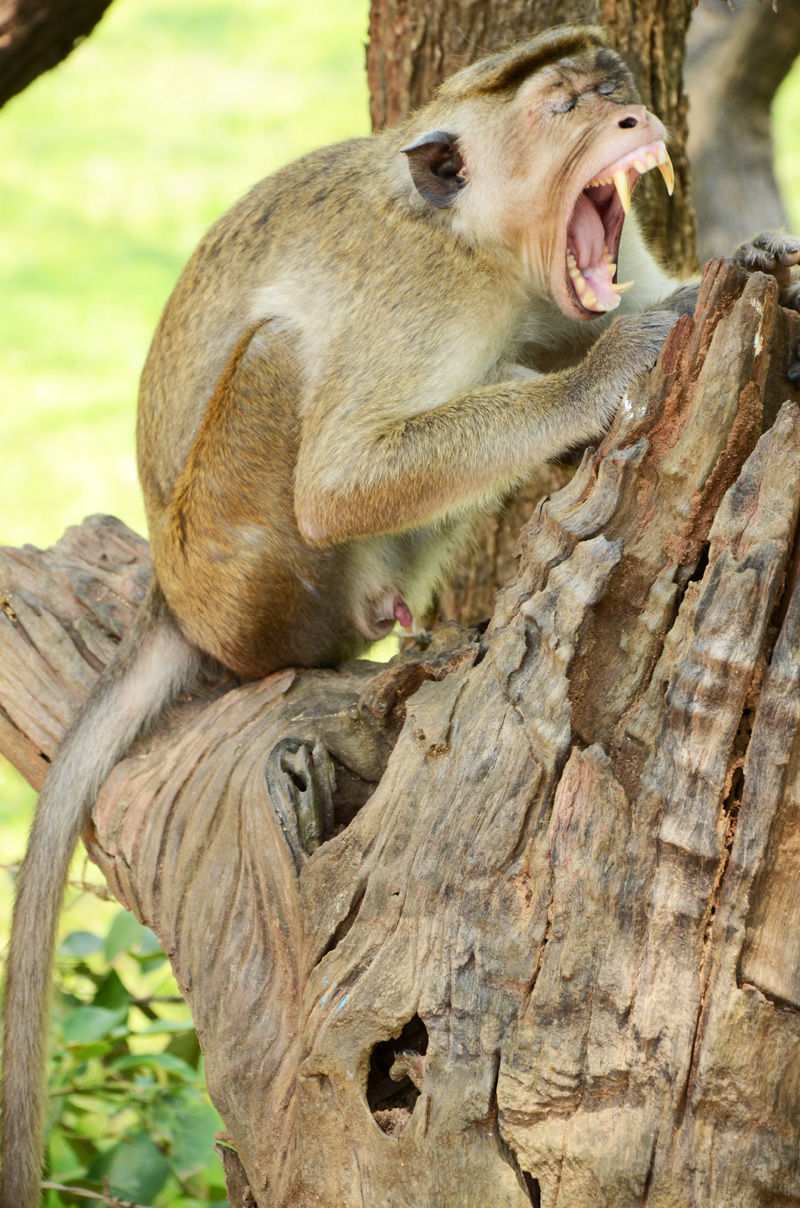 Tornando alle prime righe in cui il miele scorreva sulle fette biscottate e lo scoiattolo zompettava all’apparenza spensierato sul ramo dell’albero, la sedia su cui il nostro culino stava poggiando era situata su territorio cingalese, per la cronaca. Per il viaggiatore una delle tante attrazioni dello Sri Lanka sono le numerose specie di animali in libertà che condividono con le persone questa spettacolare isola immersa nel verde e bagnata dall’Oceano Indiano, fauna che si erge spesso a protagonista di rilievo durante le esplorazioni e le visite. Come nel caso delle scimmie, presenti quasi ovunque, ai bordi delle strade o nei templi buddisti, arrampicate sui cavi del telefono nelle città, raggruppate nei parchi o semi nascoste sugli alberi. Per chi non ha l’abitudine di vedere saltare scimmie sul tetto di casa o nel proprio giardino, i primi due giorni di permanenza in Sri Lanka sono sorprendenti; non la pensa così la guida costretta a fermare l’auto ogni un per due per far sì che esigenti visitatori possano scattare delle foto a primati di cui il Paese è fortunatamente stracolmo. DSC_1364Nel nord dello Sri Lanka in particolare, laddove l’autostrada non è ancora arrivata, sul ciglio delle strade è facile incontrare iguane e varani dalle notevoli dimensioni, alcuni dei quali innocui è già sulla via dell’addomesticamento a scopo turistico. Per ora non capiterà stessa sorte alle innumerevoli specie di volatili, tra cui il colorato Martin Pescatore, la maestosa Aquila o le volpi volanti indiane, enormi pipistrelli che si nutrono di solo frutta nonostante l’aspetto tenebroso ed inquietante facciaDSC_1564 temere il peggio. Tra il verde delle coltivazioni è invece facile imbattersi in buffali di allevamento, mentre nella boscaglia se si è fortunati è possibile l’incontro con i caprioli adulti ed i loro cuccioli, conosciuti disneianamente come Bambi. Animali sicuramente più facili da vedere anche in luoghi meno esotici ma non per questo l’incontro casuale con loro è meno emozionante. Come premesso non sempre la natura è accondiscendente con lo spirito di conquista umano ed i cingalesi non troppo di rado ne fanno le spese, pagando con la loro vita incontri con serpenti velenosi di diverso genere tra cui il famigerato cobra. DSC_1708Purtroppo proprio durante la nostra presenza si è consumata una tragedia capitata ad un signore anziano intento a coltivare il suo orticello, morso da un serpente velenoso di cui si sono perse le tracce. Fosse stato un cobra la causa della morte del pover uomo, non si sarebbe allontanato più di tanto dal corpo della vittima a differenza di altre specie che invece si disperdono velocemente nel verde circostante. Non è raffigurato sulla bandiera nazionale dove troneggia un leone con in pugno una sciabola, ma l’elefante è l’animale più simbolico e ricercato in assoluto. DSC_1941Gli enormi pachidermi dallo sguardo mansueto ma alquanto irritabili, si possono osservare in diverse versioni e, manco ci fosse il bisogno di ripeterlo, possono essere cavalcati in una passeggiata che, se non dal punto di vista del profitto per il proprietario delle bestie, azzera ogni legame con la scintillante e competitiva plasticosa vita occidentale cui apparteniamo. DSC_1883Tappa obbligata è l’Orfanotrofio degli Elefanti che accoglie centinaia di esemplari, oltretutto facilmente avvicinabili. Come si evince dal nome questi animali sono stati prelevati dopo che la solita avidità umana gli ha tolto loro i genitori, probabilmente salvandoli dallo stesso destino. Sinceramente l’ambiente è più stile circense che scientifico ed il trattamento che ricevono è discutibile. In taluni casi incatenati o costretti al contatto con gli umani che si divertono ad allungare loro caschi di banane, i pachidermi accettano loro malgrado l’offerta, sicuramente coscienti del fatto che se si trovano in quella situazione è proprio perché le persone intorno, che strillano e fan foto a raffica, ce li hanno messi. Più fortunati invece sono gli elefanti in completa libertà e che la DSC_1919sera fanno la loro comparsata ai bordi delle strade; l’istinto è quello di scendere dall’auto e scattare the pic of the week, non fosse che il rischio di subire un attacco è altissimo. Se l’avvicinamento con i mezzi non provoca reazioni inconsulte infatti, la presenza dell’uomo può giustamente essere interpretata come minaccia dagli elefanti, quasi prossimi all’estinzione dopo una permanenza sul globo di 5 milioni di anni.