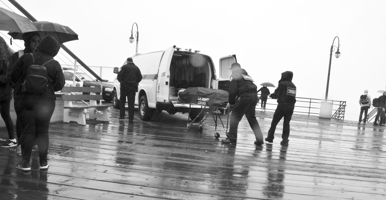 Le persone presenti videro il corpo di un uomo avvolto in un sacco che stava per essere caricato sul furgone del coroner. Le generalità erano ignote, i motivi del decesso altrettanto. L’unica cosa certa era che quel giorno pioveva ed anche parecchio, così da costringere gli agenti della polizia a fare piuttosto in fretta nel rimuovere quel cadavere. L’acqua che scendeva fitta sulla banchina del Santa Monica Pier comunque non ostacolava la curiosità dei turisti che non persero occasione per fare qualche foto a quella che sembrava la scena di un film. I più audaci andarono subito a ricercare altri indizi tra le scalinate in prossimità del ritrovamento.