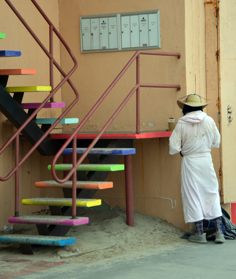 Cammina lungo la spiaggia quando un uomo in divisa gli si avvicina. Gli allunga benevolmente dieci dollari invitandolo con aria fintamente severa a comportarsi bene. L’uomo accetta e sfoggia un sorriso senza qualche dente. Li accartoccia nella tasca della camicia. Un barbone che ha assistito alla scena cerca di sfilargli i soldi dalla tasca ma lui riesce a divincolarsi e camminare dritto. Il Santa Monica Pier è a mezz’ora di cammino e lo vuole raggiungere. Là troverà riparo dal vento che soffia sempre più forte e dalle nuvole in lontananza che non promettono nulla di buono. Spinge un vecchio carrello della spesa che trasporta il suo sacco. Usa parte del telo per ripararsi dalla pioggia che intanto ha cominciato a cadere fitta. In queste condizioni non basta una mezz’ora per raggiungere il molo ma passo dopo passo ci arriverà. Senza pensare a nulla; libero.