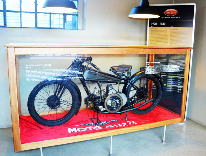 DSC_0452In ogni caso l’Ing. Carlo e l’aviatore Giorgio, grazie ad un prestito iniziale di 2000 Lire da parte del padre di quest’ultimo che credeva nel progetto del figlio e del suo amico ingegnere nel 1921 gettarono le fondamenta di quella che sarebbe diventata un mito, la Società omonima Moto Guzzi. In un angolo del museo dedicato alla riproduzione dell’ufficio dell’Ing. Carlo Guzzi è ancora presente la lettera originale dove il padre Emanuele Vittorio Parodi specifica che il prestito sarebbe stato un investimento iniziale in attesa di verificare lo svolgimento del progetto. Il logo sarà un aquila, lo stesso utilizzato dall’Aviazione Navale, dedicato al loro amico e socio Giovanni Ravelli, scomparso in un incidente aereo.   DSC_0444