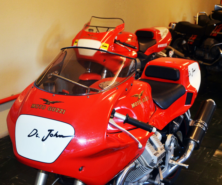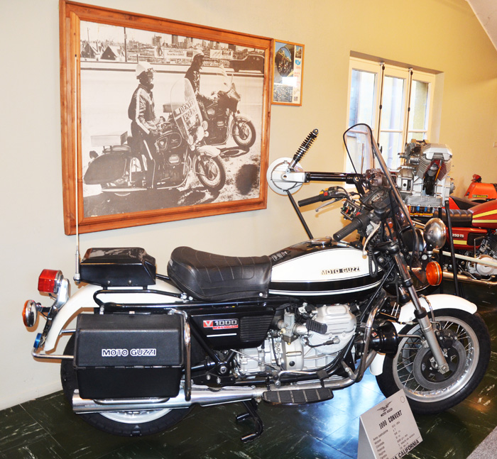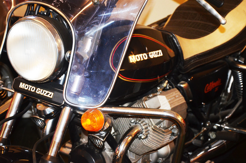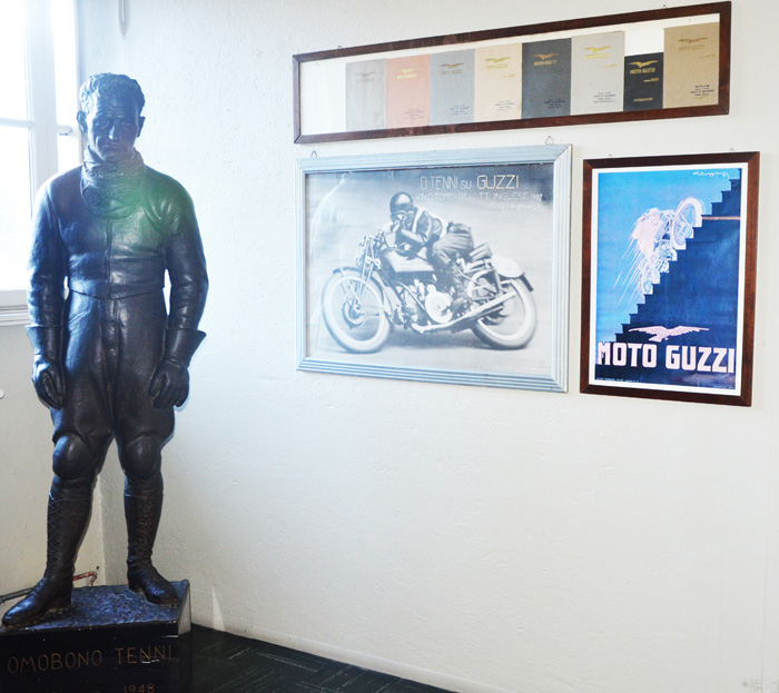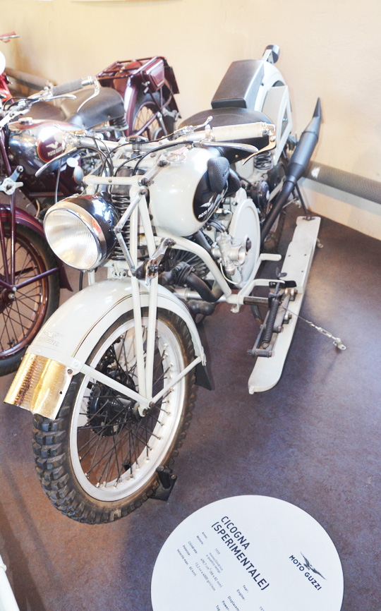 DSC_0450Indubbiamente interessante la veste moderna della linea Moto Guzzi che vuole intelligentemente far valere il suo passato con evidenti richiami storici che si abbinano in modo affascinante alle nuove tecnologie facendo trasparire quell’umanità di cui le persone sentono sempre più il bisogno di legarsi. L’avevo scritto nel post del Mugello, moto e motori sono la goccia d’olio che cade dal carter (caratteristica tipica delle vecchie Moto Guzzi), la brugola e la martellata per adattare la bandinella o un soffio nel carburatore per ripulirlo dalle schifezze. Ogni moto parcheggiata nei corridoi del museo ha una sua storia, un suo aneddoto che Walter mi racconta con passione ed orgoglio; storie di persone comuni, di ingegneri che già negli anni 50 hanno avuto idee rivoluzionarie ed impensabili ancora oggi come l’addetto stampa che in sella ad un cinquantino si è girato l’Africa, la moglie di un appassionato belga che alla morte del marito ha donato la sua moto al museo perché orgogliosa di rivederla esposta, alla moto con gli sci laterali costruita specificatamente per la Polizia Norvegese mai ritirata ed abbandonata sotto una pergola a Mandello, anche quest’ultima donata dai proprietari alla Moto Guzzi. DSC_0443