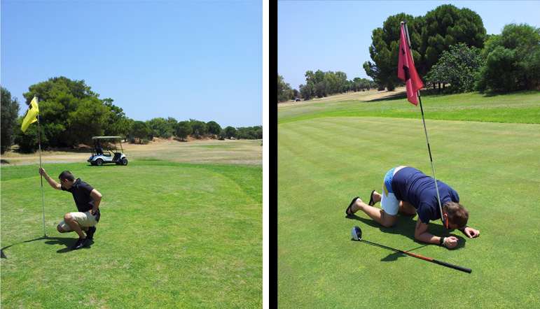 Fatto sta che per un attimo il mio metabolismo da ricco è stato in parte appagato quando abbiamo visto avvicinarsi alla rete di recinzione delle comuni persone in costume da bagno che avranno pensato chissà cosa su di noi prima che constatassimo che tale curiosità derivava non dal chi eravamo noi, ma per Daniele: vedere uno in infradito, bermuda ed occhiali da sole fluorescenti che “gioca” a golf non è roba da tutti i giorni.