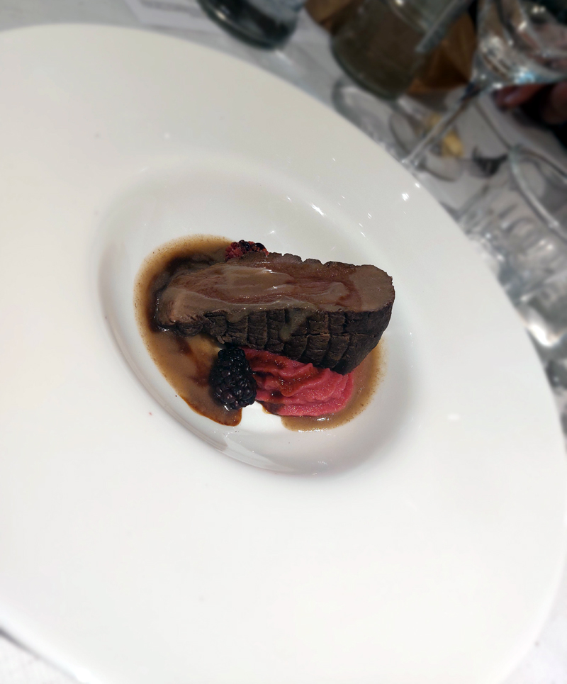 Questi ultimi hanno coraggiosamente presentato una loro creazione che non solo non ha sfigurato al cospetto degli chef stellati ma anzi ha ricevuto moltissimi pareri entusiastici da parte dei circa cento commensali che hanno avuto il privilegio di prendere parte alla degustazione. Nello specifico parliamo di un secondo piatto composto da filetto di cervo cotto a bassa temperatura, con purè di barbabietola e patate e ristretto di mosto invecchiato 18 anni Asperum Midolini.