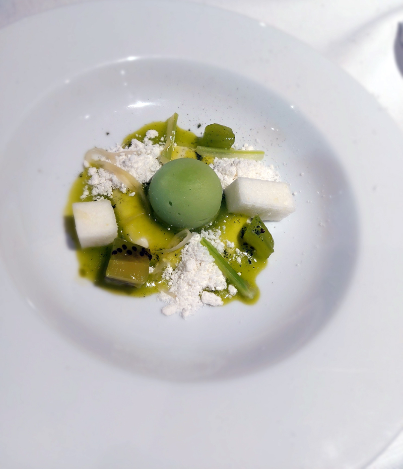 Se proprio vogliamo spiegare le vele e navigare tra le onde dell’eccellenza culinaria ecco una breve descrizione dei piatti presentati dagli chef stellati: Metullio e De Pra hanno fatto uscire dalla cucina un primo piatto che è stato un superbo ed equilibrato risotto mantecato al burro di malga, buccia di limone, polvere di liquirizia, polvere di nero di seppia e ricci di mare. Si sono occupati anche del dessert, apoteosi di gusti e freschezza che ha elegantemente chiuso l’esperienza: zuppetta di kiwi, yogurt, cioccolato bianco con centrifuga di sedano e mela verde, sorbetto di mela verde, meringa sbriciolata e marshmallow al limone.