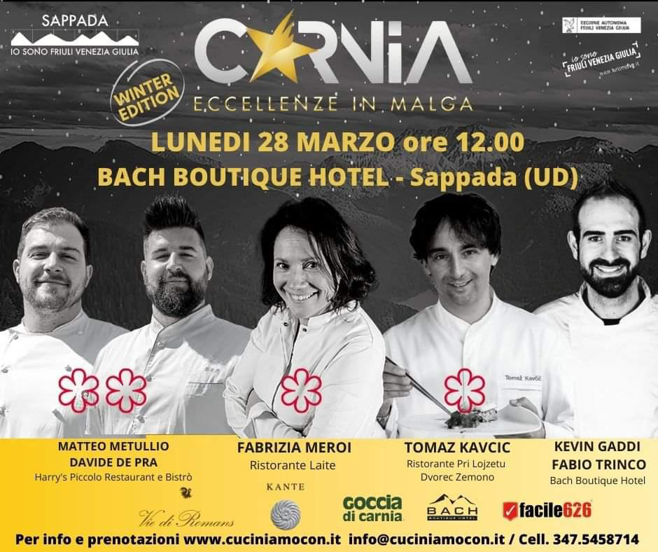 Tra gli ospiti illustri che hanno reso la giornata davvero indimenticabile, va sottolineata la presenza indispensabile alla buona riuscita dell’evento patrocinato dalla Regione Friuli Venezia Giulia, delle qualificate e piacevoli ragazze della Latteria Plodar Kelder di Sappada che con la loro selezione di formaggi hanno fin dal momento dell’aperitivo fatto presagire livelli qualitativi eccellenti; così come il maitre ed i camerieri della scuola alberghiera che hanno davvero lavorato nel migliore dei modi prodigandosi a far sì che il servizio sia all’altezza e che potranno vantare alla loro giovane età un’esperienza professionale unica. Così tra vapori e pizzichi di sale, papabile passione e tanti discreti sorrisi si è conclusa una giornata meravigliosa che finirà di diritto nelle pagine più belle ed indelebili della memoria storica dei fortunati partecipanti e del Bach Boutique Hotel che già scalpita in attesa di nuove emozioni da proporre ai suoi ospiti.