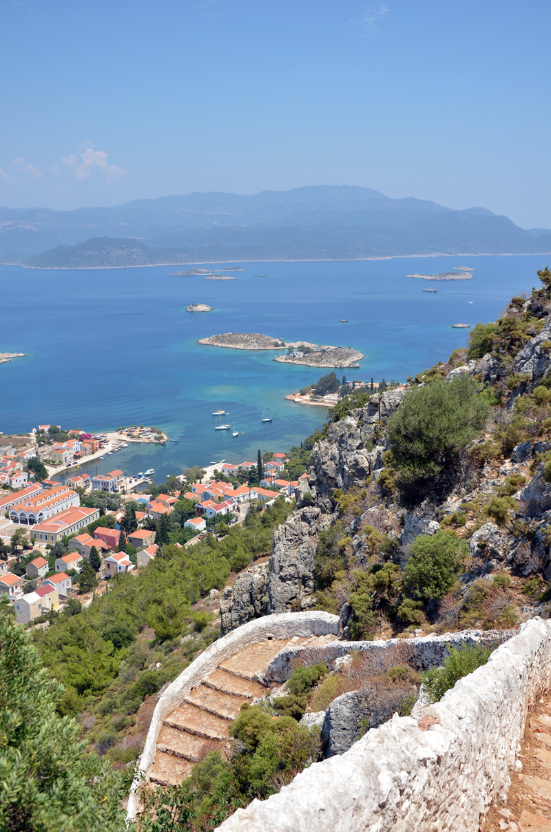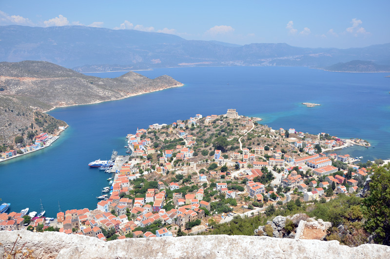 La vista migliore in ogni caso è il premio dei più audaci, ossia le persone che nonostante le temperature pomeridiane ai massimi livelli intraprendono il cammino su una scala in pietra non proprio agevole che promette di vedere l’antica Kastellorizo, una volta giunti a destinazione. Sarà, ma dopo aver inzuppato la maglietta ad accoglierci ci sarà un paesaggio carsico in un assordante silenzio scandito dall’incessante suono delle cicale. In compenso sarà proprio quello il punto migliore dove scattare foto suggestive e realmente panoramiche.