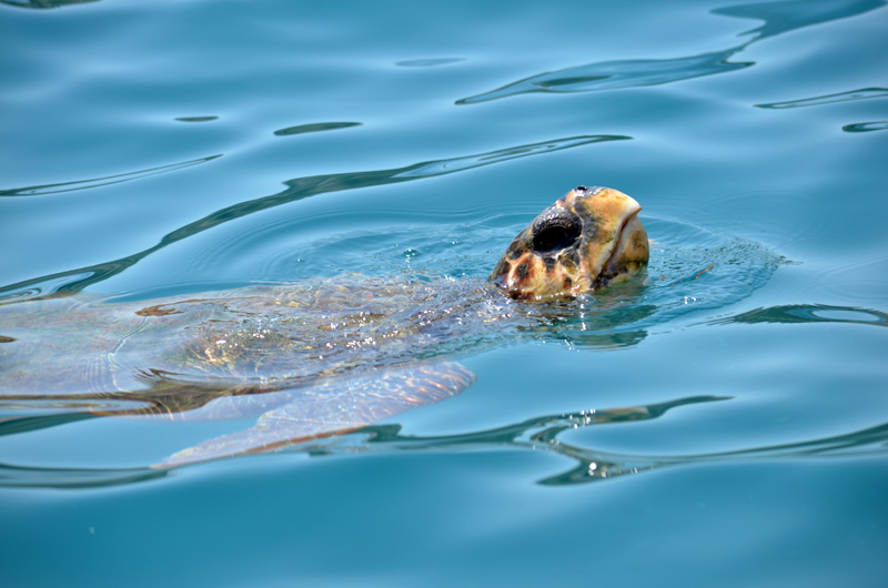 Buon segno per la salute del mare anche la presenza di tartarughe, che salgono in superficie a respirare quasi con timidezza protette dal loro milionario carapace e che ovviamente diventano interessante preda dei turisti in cerca di foto; tra loro c’è chi usa il richiamo del gatto per farle avvicinare (ma è una tartaruga), altri che buttano pezzi di pane (si nutre di pesci, crostacei, calamari…), altri ancora che cercano di tuffarcisi sopra (e lei si immerge).